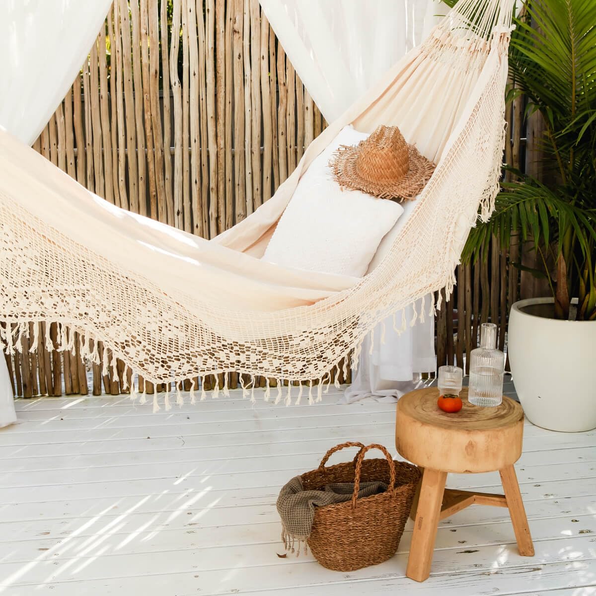 - Hand-Crocheted Fringe: Beautifully designed interlaced fringe, crafted by hand, adds an elevated and stylish touch to the hammock.