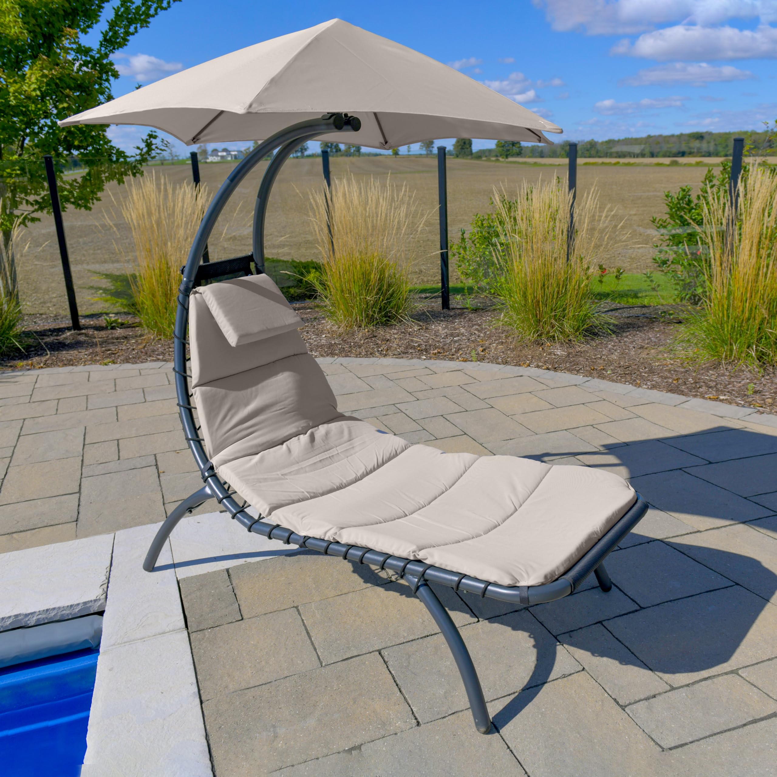 Vivere Original Dream Lounger with 6-Point Umbrella – Durable Spun Polyester, Curved Legs, Spacious Lounging Bed, Perfect for Outdoors & Patio, 74" x 41" x 84" (Cast Silver)